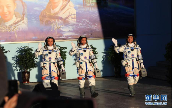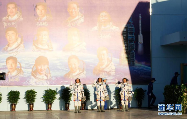 6月17日,神舟十二號航天員出征儀式在酒泉衛星發射中心舉行。這是航天員聶海勝(中)、劉伯明(右)和湯洪波在出征儀式上揮手。新華社記者 琚振華 攝