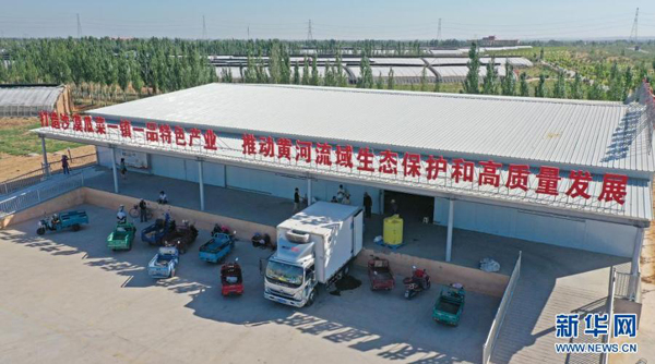 在寧夏石嘴山市平羅縣陶樂鎮(zhèn)沙漠瓜菜園區(qū)冷鏈庫,冷鏈車準備運輸沙漠瓜菜(無人機照片,7月7日攝)。