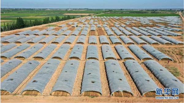 寧夏石嘴山市平羅縣陶樂鎮(zhèn)廟廟湖沙漠瓜菜園區(qū)瓜菜大棚(無人機照片,7月7日攝)。
