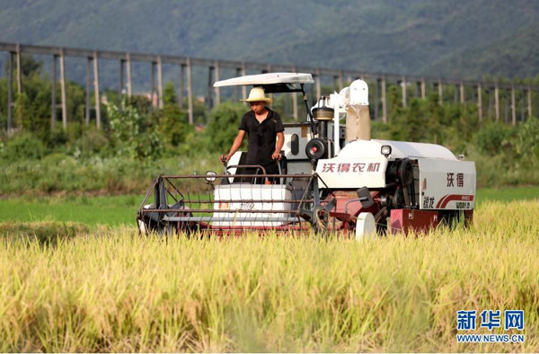 8月12日,在湖南省資興市三都鎮(zhèn),農(nóng)民駕駛收割機(jī)收割稻谷。