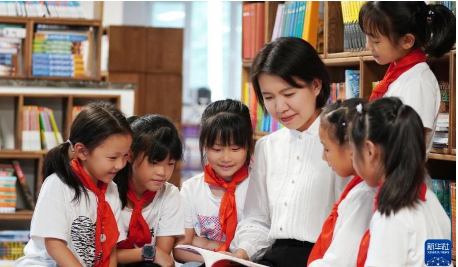 9月7日,沈陽市渾南區第九小學教師陳秋穎陪伴學生閱讀。新華社發