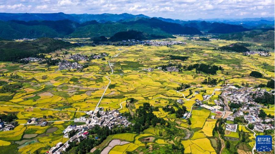 連日來,貴州省黔南布依族苗族自治州龍里縣灣灘河鎮天氣晴好。水稻成熟,田野鍍金,農民搶收稻谷,一片豐收景象。