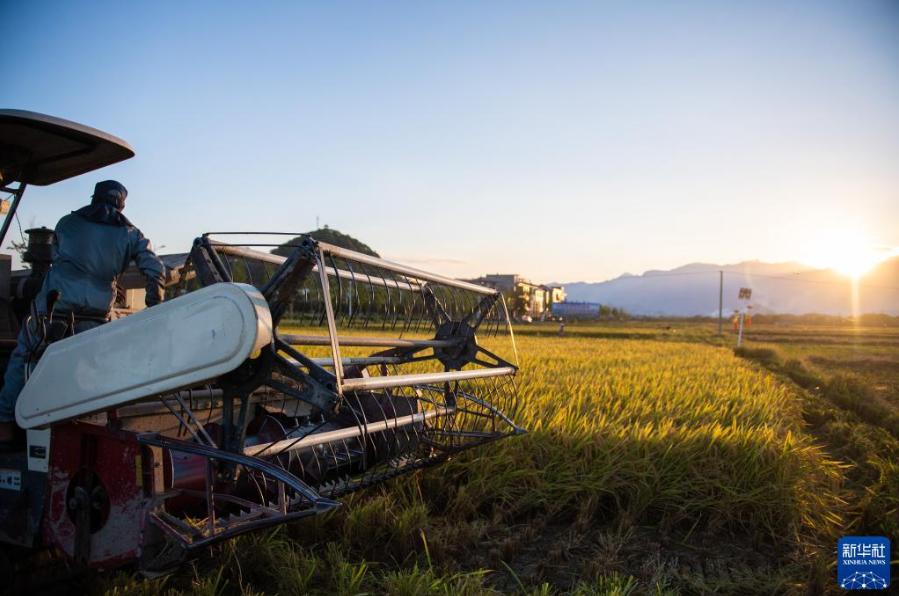 8月30日,工作人員駕駛收割機在湖南道縣清塘鎮濂溪大洞收割水稻。