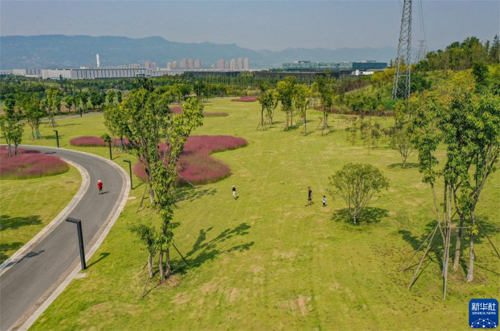10月2日,人們在重慶市兩江新區粉黛山公園游玩(無人機照片)。