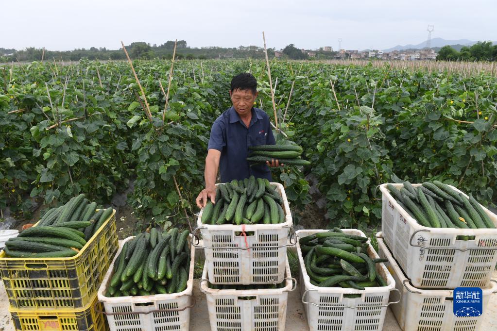 11月4日,在廣西田東縣平馬鎮百林村,村民在采摘黃瓜準備上市。