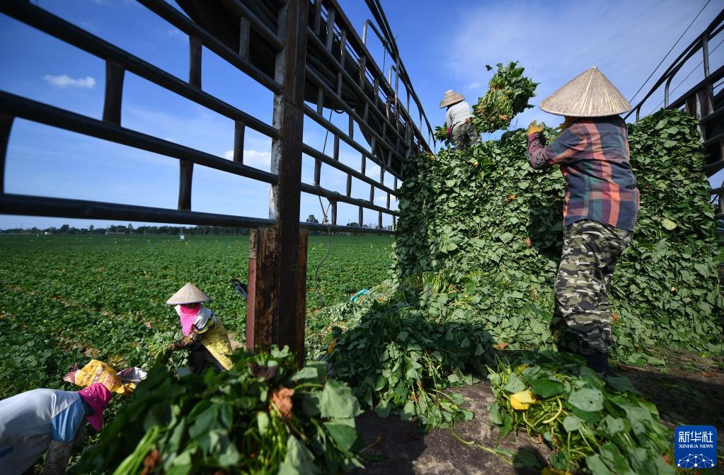 11月15日,東方市四更鎮沙村的農民將地瓜苗裝車。新華社記者 郭程 攝
