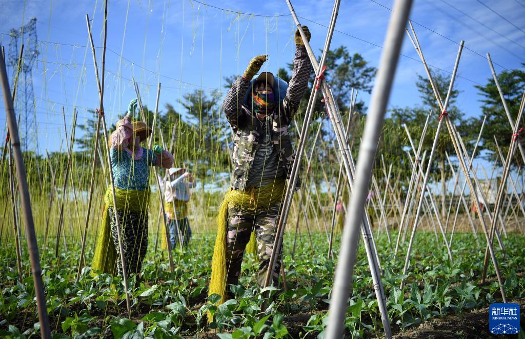 11月16日,三亞市崖州區的農民在田間給豇豆搭架。新華社記者 郭程 攝