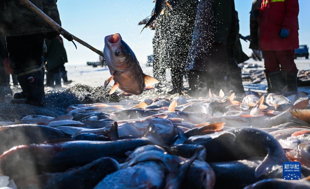 12月26日拍攝的漁民從湖里打撈到查干湖冰面上的魚。
