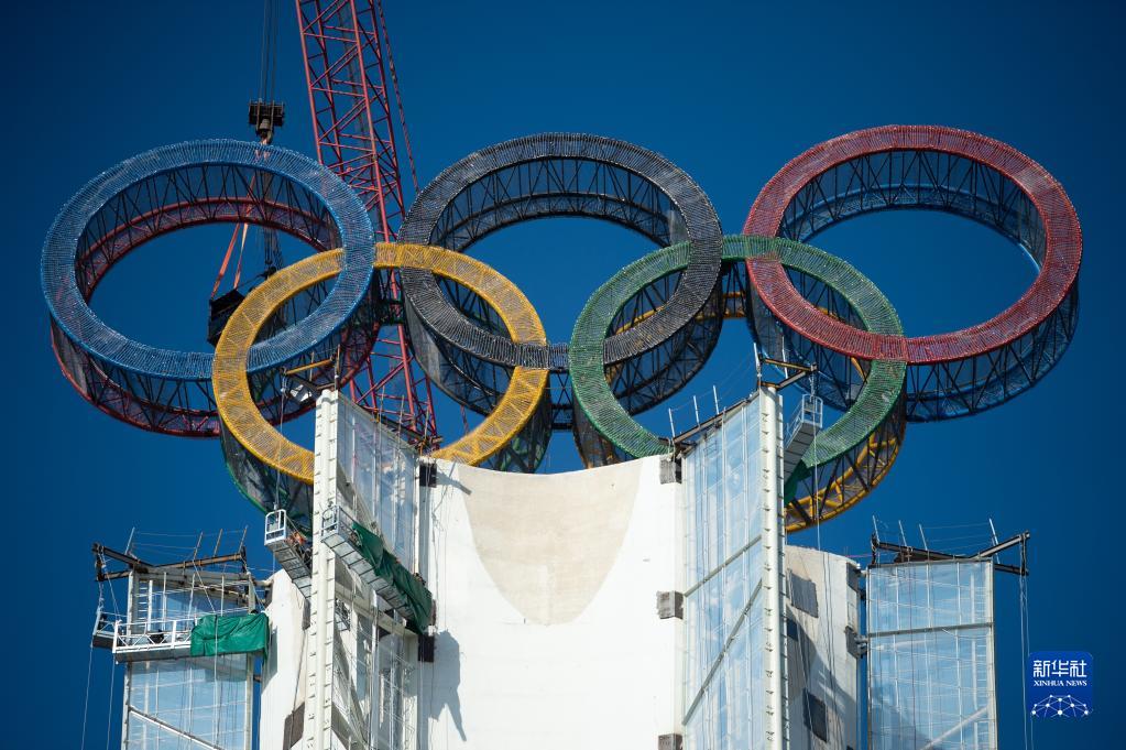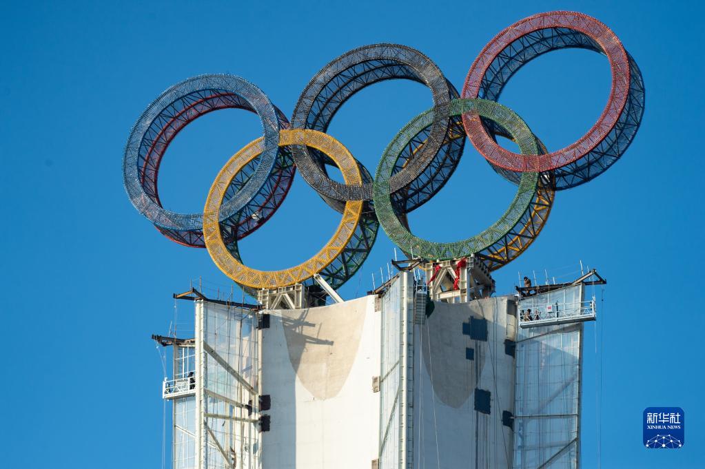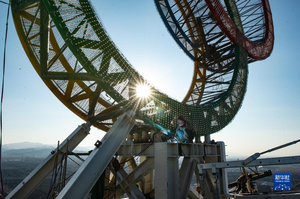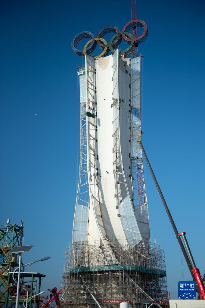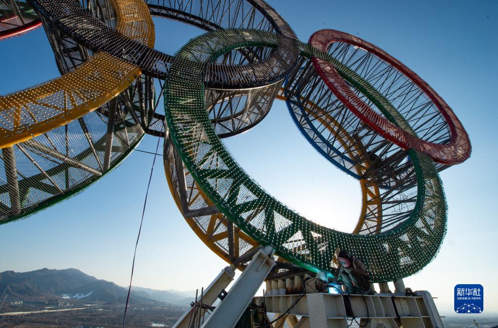 近日,位于北京冬奧會延慶賽區的“海陀塔”上的奧運五環結構吊裝作業完成,進入工程收尾階段。塔頂設置奧運五環標志,表面安裝了共計7萬余個白色點光源,塔身加裝飄帶形裝飾。