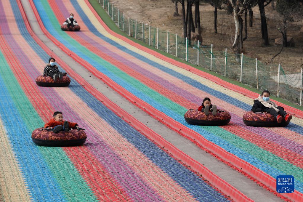 2月8日,小朋友們在張八橋鎮(zhèn)“鄉(xiāng)村游樂場”玩彩虹滑道。