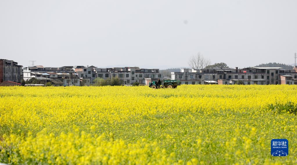 3月9日,湖南省資興市蓼江鎮農戶駕駛拖拉機從油菜花海中穿過。