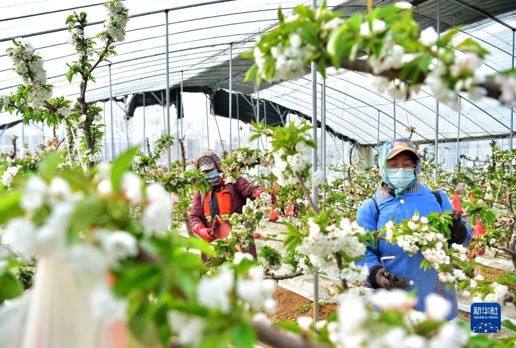 3月9日,在河北省石家莊市鹿泉區山尹村鎮的櫻桃種植基地,當地農民進行櫻桃花授粉。