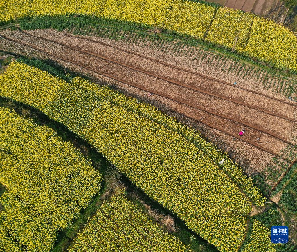 3月9日,在四川省南充市蓬安縣睦壩鎮武勝村,村民在田間勞作(無人機照片)。