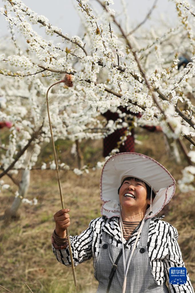 3月9日,四川省廣安市武勝縣鳴鐘鎮小寨村的果農給李花授粉。