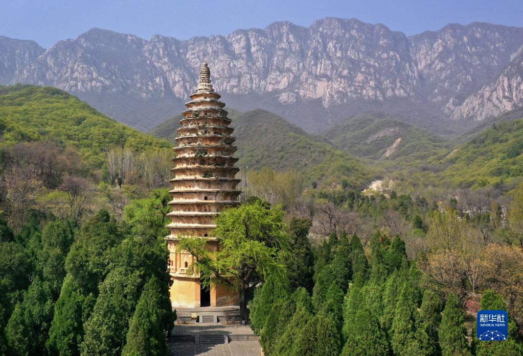 這是登封“天地之中”歷史建筑群中的嵩岳寺塔(4月7日攝,無人機照片)。