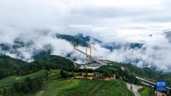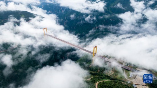 普立大橋位于云南省曲靖市宣威市,橫跨寶山、普立兩個鄉(xiāng)鎮(zhèn),是一座高速公路鋼箱梁懸索橋,全長1040米,橋面距離谷底達(dá)500米。大橋所在地山勢陡峭,六月當(dāng)?shù)赜昙旧介g云霧繚繞,黃色的大橋在云海之中若隱若現(xiàn),宛如建設(shè)在云層之上。