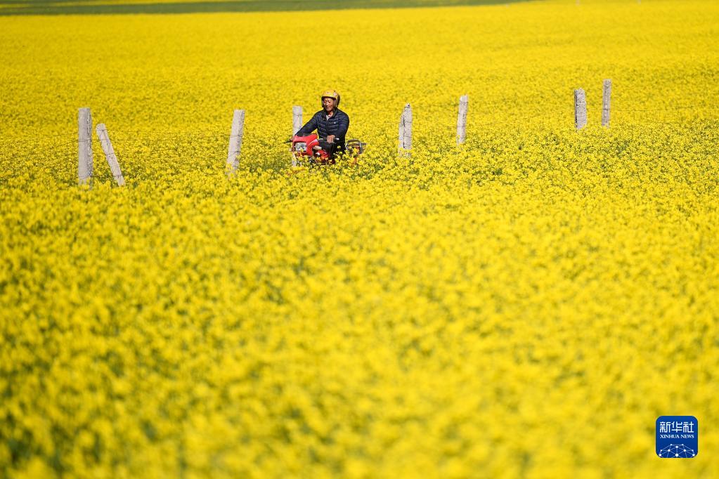 進入七月,位于青海省海北藏族自治州門源回族自治縣的萬畝油菜花競相綻放。來自四川德陽的蜂農馮躍宣在花海里忙碌。他從早上7點開始整理蜂箱、采集花粉、晾曬花粉,一直忙碌到晚上8點。