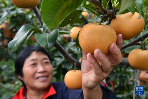 8月31日,寶豐縣欣榮種植專業合作社的社員在采摘梨果。