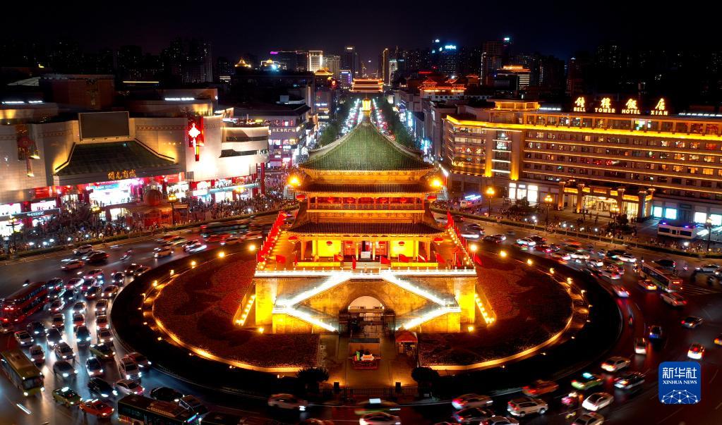 西安鐘樓夜景(5月2日攝,無人機照片)。