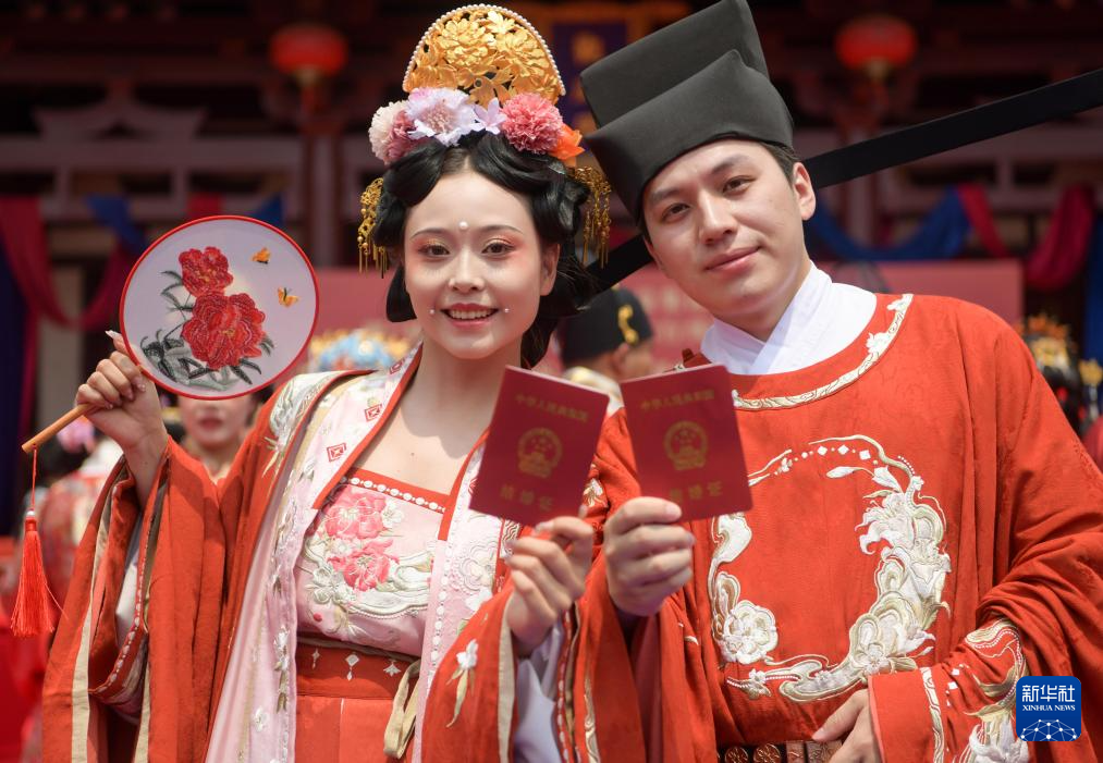 5月20日,在河南省洛陽市上陽宮,參加公益集體傳統婚禮的一對新人展示自己的結婚證。
