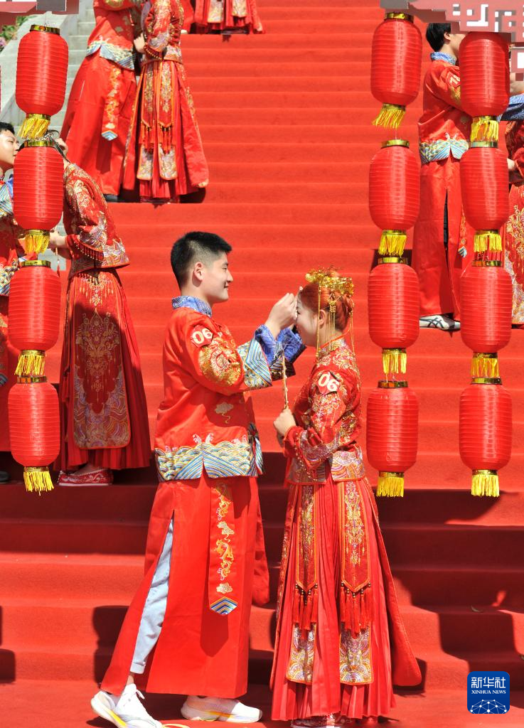 5月20日,在四川省南充市嘉陵江畔,身穿中式禮服的新人在集體婚禮上喜結良緣。