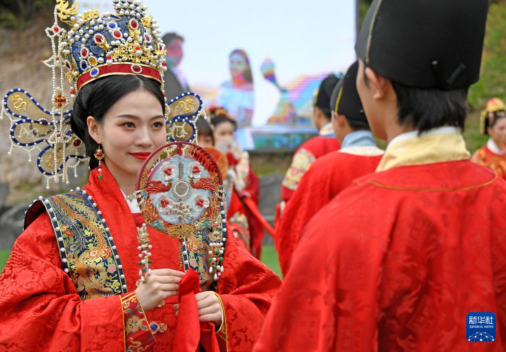 5月20日,在浙江省臺州市仙居縣神仙居景區南天頂,新人參加宋韻集體婚禮。